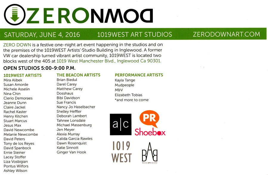 As wonderfully written on the flyer, 'ZERO DOWN is a festive one-night art event happening in the studios and on the premises of the 1019WEST Artists' Studio Building in Inglewood. A former VW car dealership turned vibrant artist community, 1019WEST is located two blocks west of the 405 at 1019 WEST Manchester BLVD Inglewood, CA 90301'.